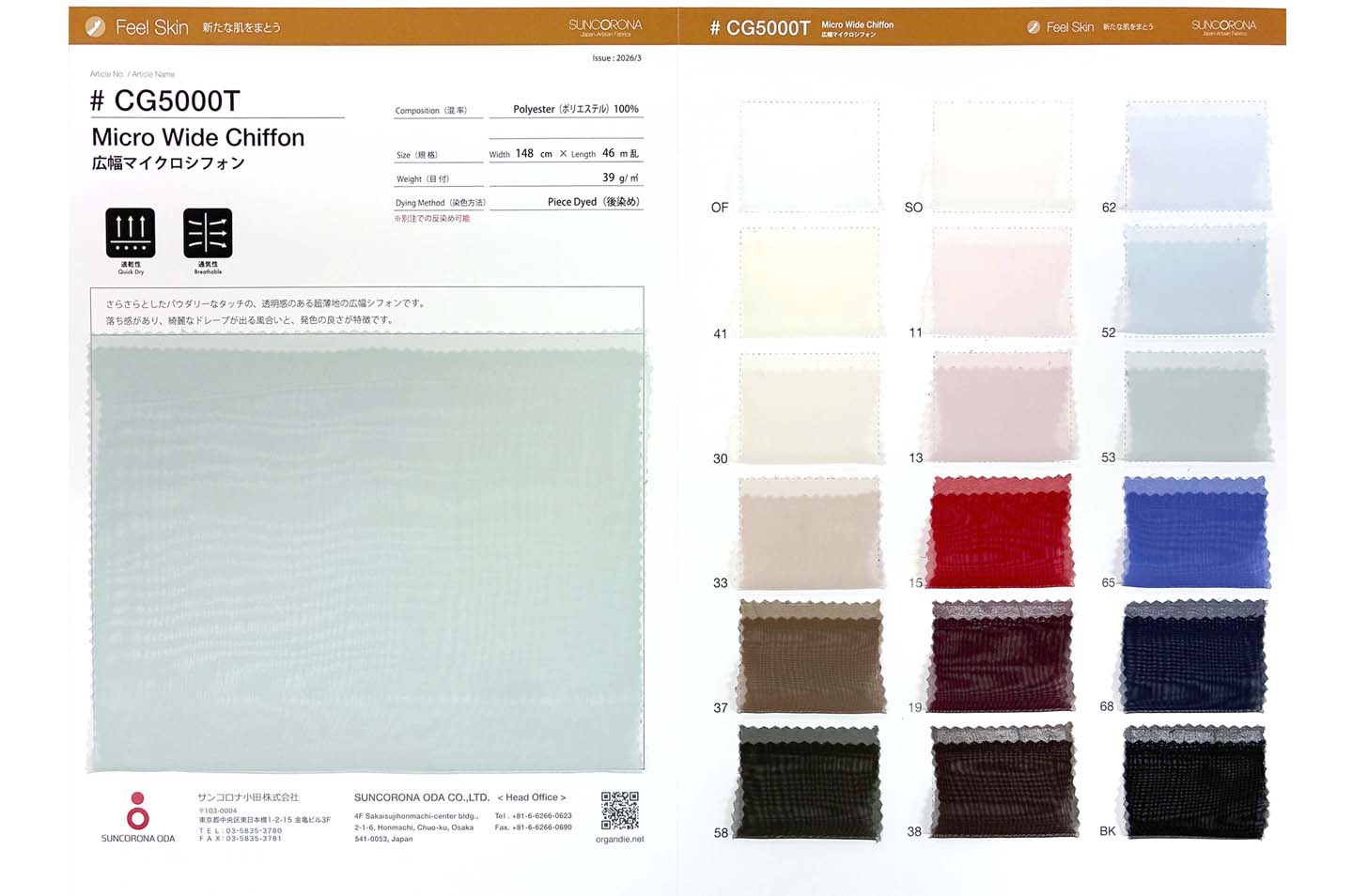 こちらの商品のリリースに伴い、これまで取り扱っておりました#CG5000 広幅マイクロシフォンは現在庫が無くなり次第、こちらの新品番に順次移行してまいります。