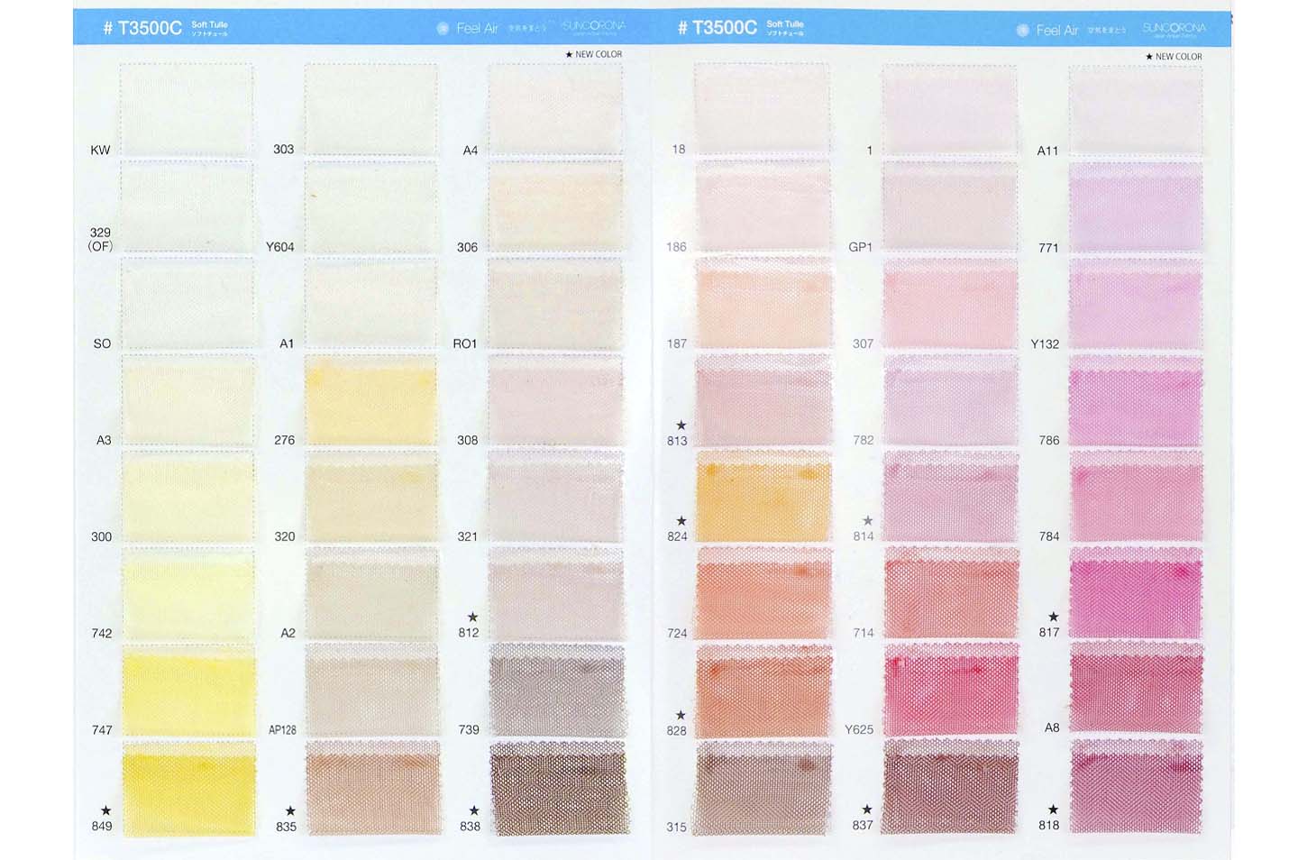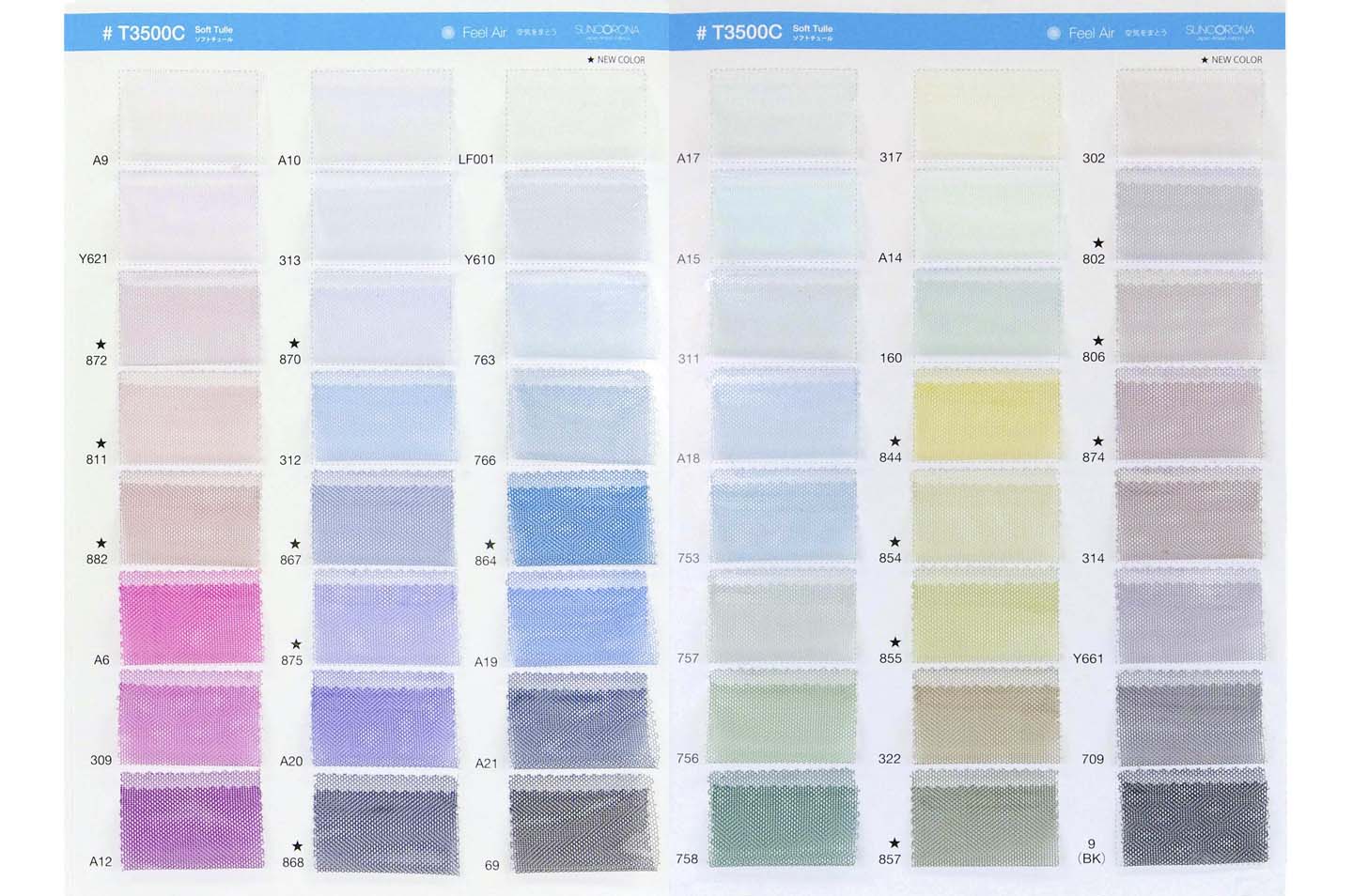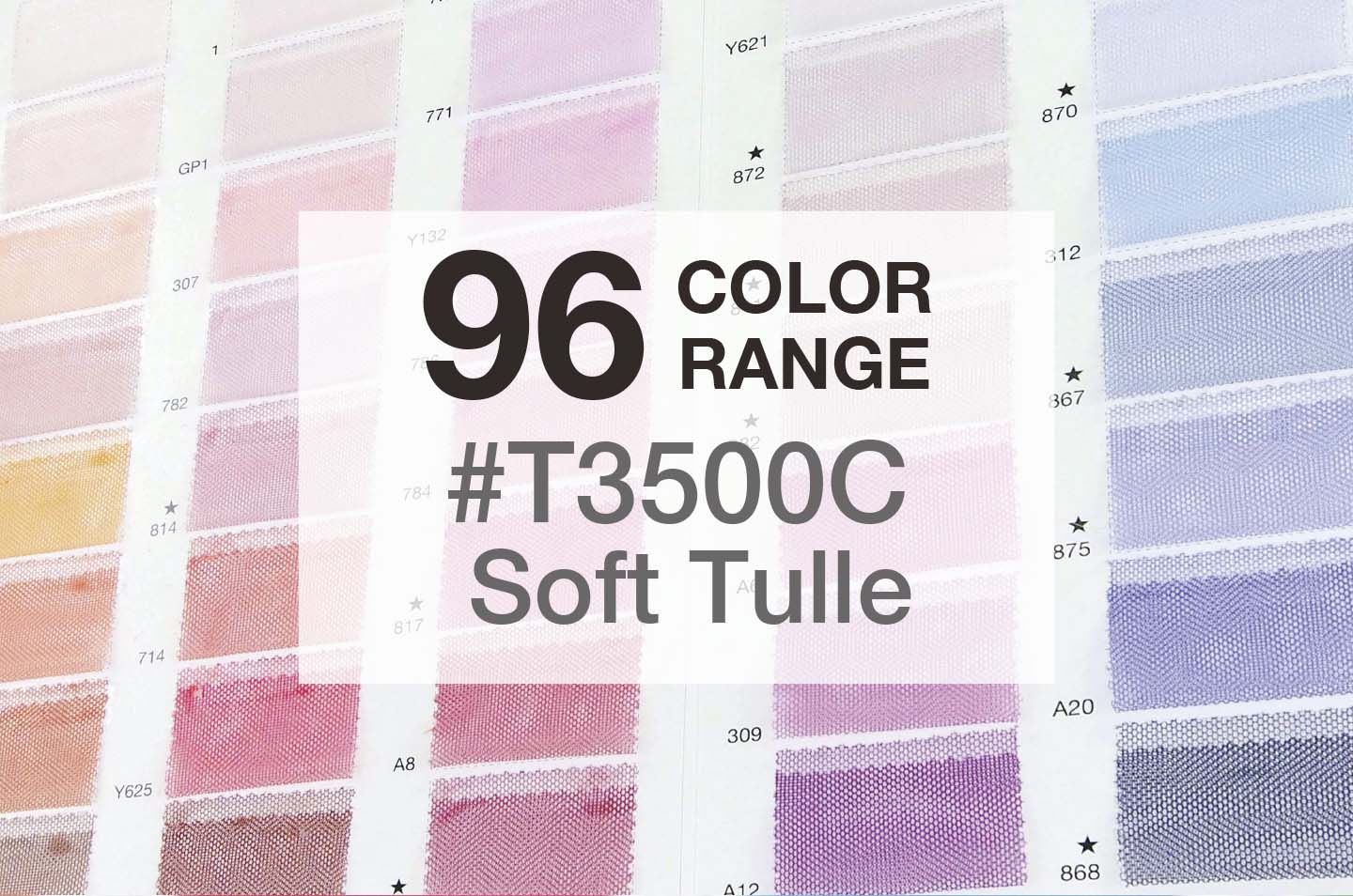 この度、弊社定番商材であるT3500Cソフトチュールの展開色を26増色。これにより定番色の展開が全96色となります。